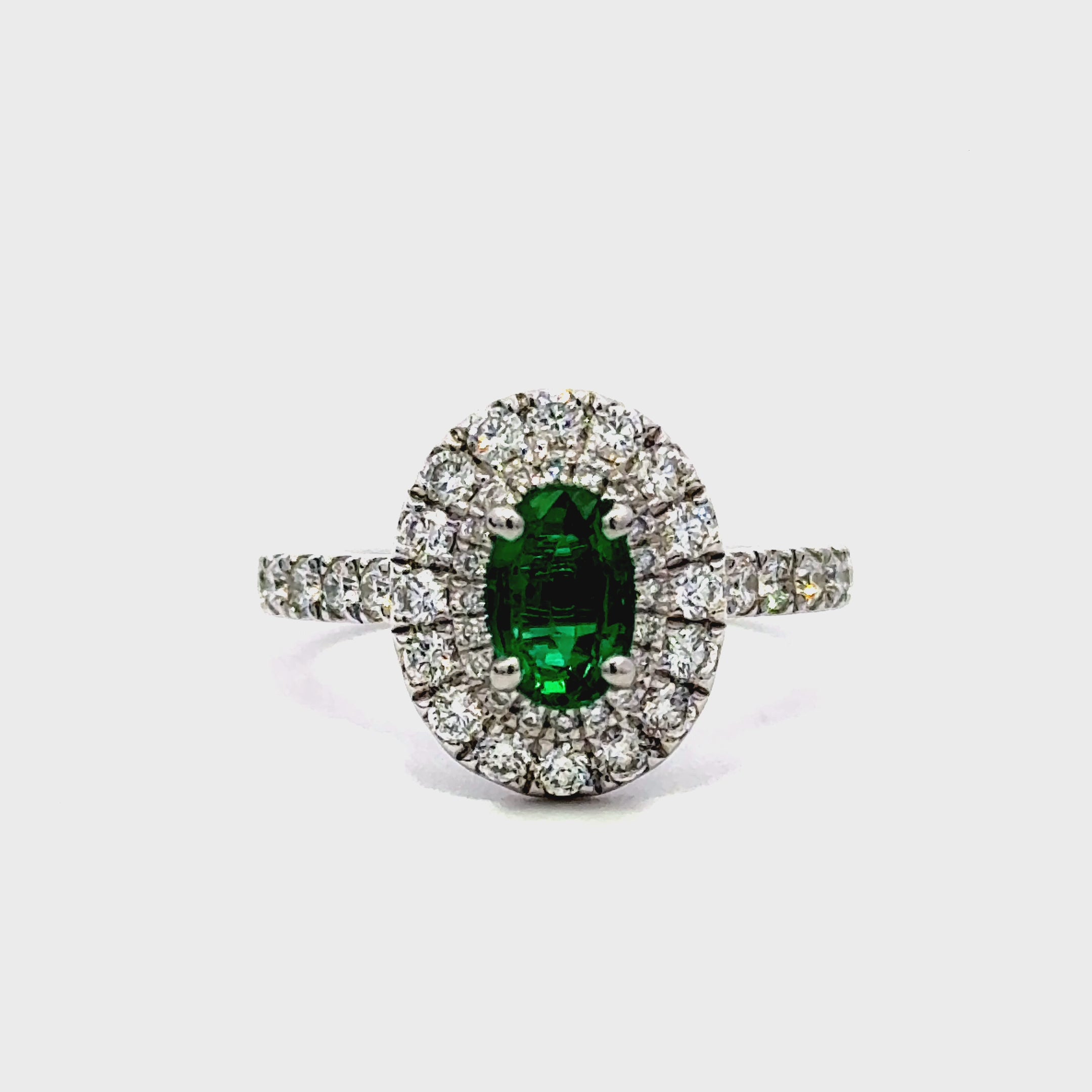 Emerald 1.25ct and Diamond 0.56ct Halo Ring in Platinum