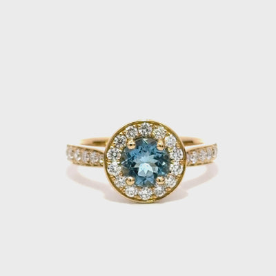 Graceful and radiant, this halo ring showcases a 0.64ct round-cut aquamarine at its heart — celebrated for its cool, serene tone and crystalline clarity. Surrounding the central stone is a shimmering halo of round brilliant diamonds, totalling 0.47ct, elegantly set in 18k yellow gold.