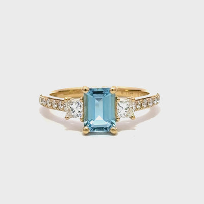 This refined three-stone ring showcases a striking 0.77ct emerald-cut aqua at its centre, flanked by two princess-cut diamonds totalling 0.41ct. The crisp geometry of the stones is beautifully set in warm 18k yellow gold, creating a look that is both contemporary and timeless.