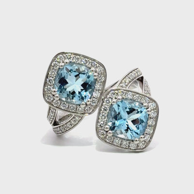 Statement symmetry and soft luminosity define this double aqua and diamond crossover ring. Crafted in platinum, this unique design features two vibrant 2.77ct cushion-cut aquamarines, each framed by a shimmering halo of round brilliant diamonds totaling 0.61ct.