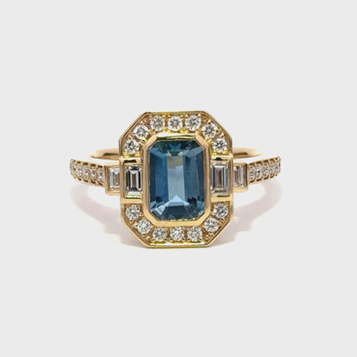 Set in warm 18k yellow gold, this exquisite ring features a vibrant emerald-cut aquamarine weighing 0.76ct, encased in a double row of sparkling round and baguette-cut diamonds totalling 0.49ct. The crisp geometry of the emerald cut contrasts beautifully with the brilliance of the halo, giving the piece both structure and light.