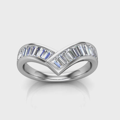This baguette diamond wishbone ring features a sleek curved design set with perfectly aligned baguette-cut diamonds in a secure channel setting. The V-shaped profile makes it ideal for pairing with engagement rings, enhancing solitaires and halos with a clean, modern contour.