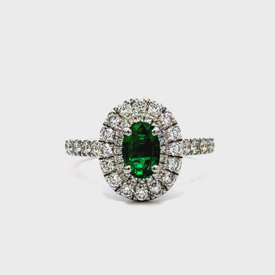 This elegant cluster ring showcases a vivid 0.61ct oval-cut emerald, framed by two rows of dazzling round brilliant diamonds. Crafted in solid platinum, the design balances vibrant colour with exceptional sparkle and refined detail.
