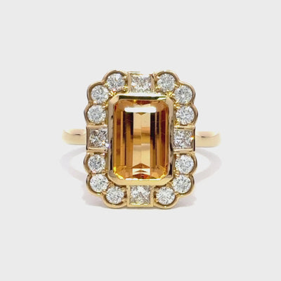 Warm, luminous, and exquisitely crafted this golden topaz and diamond halo ring brings sunshine to your jewellery collection. The design features a 2.66ct emerald-cut golden topaz with rich honeyed tones, set in a bold claw setting that enhances its clean lines and natural brilliance.