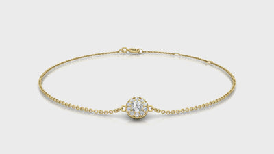 Understated yet radiant, our Diamond Halo Solitaire Bracelet is a refined expression of modern elegance. At the centre of this delicate chain sits a round-cut diamond, surrounded by a fine halo of smaller stones to enhance its brilliance — creating the illusion of a larger centrepiece with every shimmer.