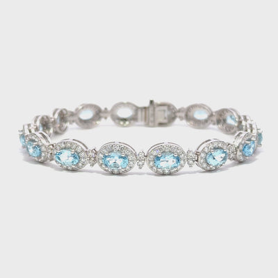 Serene and sophisticated, our oval aquamarine and diamond halo bracelet brings a breath of freshness to your fine jewellery collection. Soft sea-blue aquamarines are expertly cut into elegant oval shapes and surrounded by delicate halos of pavé diamonds, adding a radiant touch of sparkle to each stone.