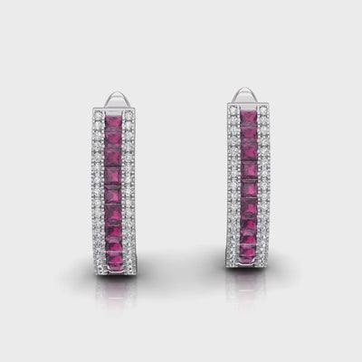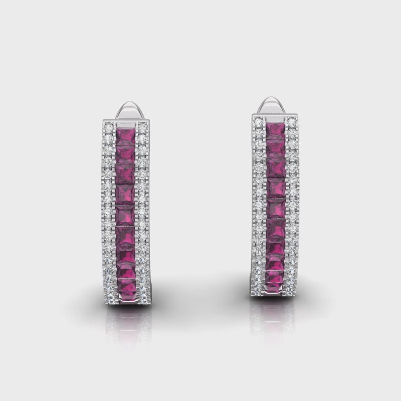 These princess cut ruby and diamond hoop earrings combine vivid colour with refined sparkle. A channel of square gemstones runs through the centre of each hoop, framed by rows of micro set round diamonds.