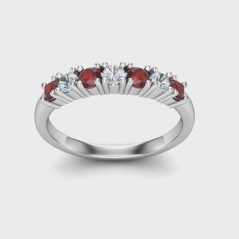 This ruby and diamond 7 stone ring is designed for those who love bold colour and timeless elegance. Each round ruby is chosen for its rich red tone and is alternated with sparkling round diamonds to create a striking band of colour and light.