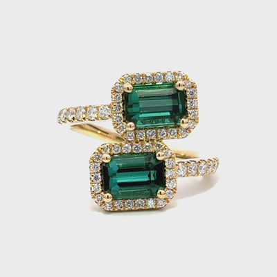 This striking design centres around two vibrant emerald-cut teal sapphire totalling 2.23ct, framed in a halo of round brilliant diamonds for enhanced brilliance and contrast. Crafted in rich 18k yellow gold, the bold geometry and crisp setting evoke a timeless glamour that stands out from every angle.